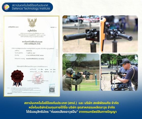 สทป. และ บริษัท สหพิพัฒนกิจ จำกัด หนึ่งในบริษัทร่วมทุนภายใต้ชื่อ บริษัท อุตสาหกรรมผลิตอาวุธ จำกัด ได้รับอนุสิทธิบัตร "ท่อลดเสียงอาวุธปืน" จากกรมทรัพย์สินทางปัญญา (วันที่ 4 ธันวาคม 2568)
