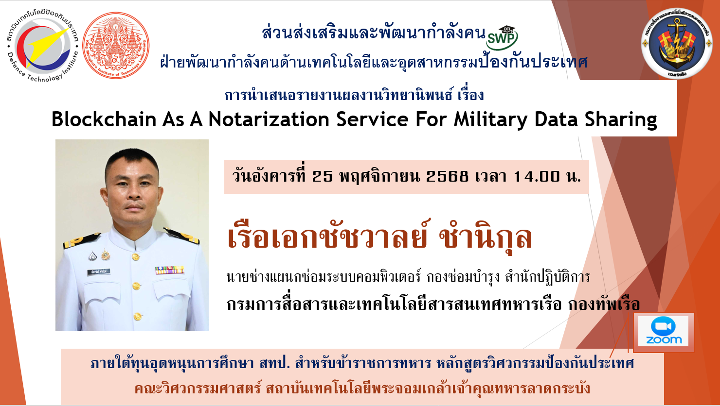 25พ.ย.68 ถ่ายทอดองค์ความรู้วิทยานิพนธ์ เรื่อง เรื่อง “Blockchain As A Notarization Service For Military Data Sharing” โดย เรือเอก ชัชวาลย์ ชำนิกุล นายช่างแผนกซ่อมระบบคอมพิวเตอร์ กองซ่อมบำรุง สำนักปฏิบัติการ กรมการสื่อสารและเทคโนโลยีสารสนเทศทหารเรือ กองทัพเรือ