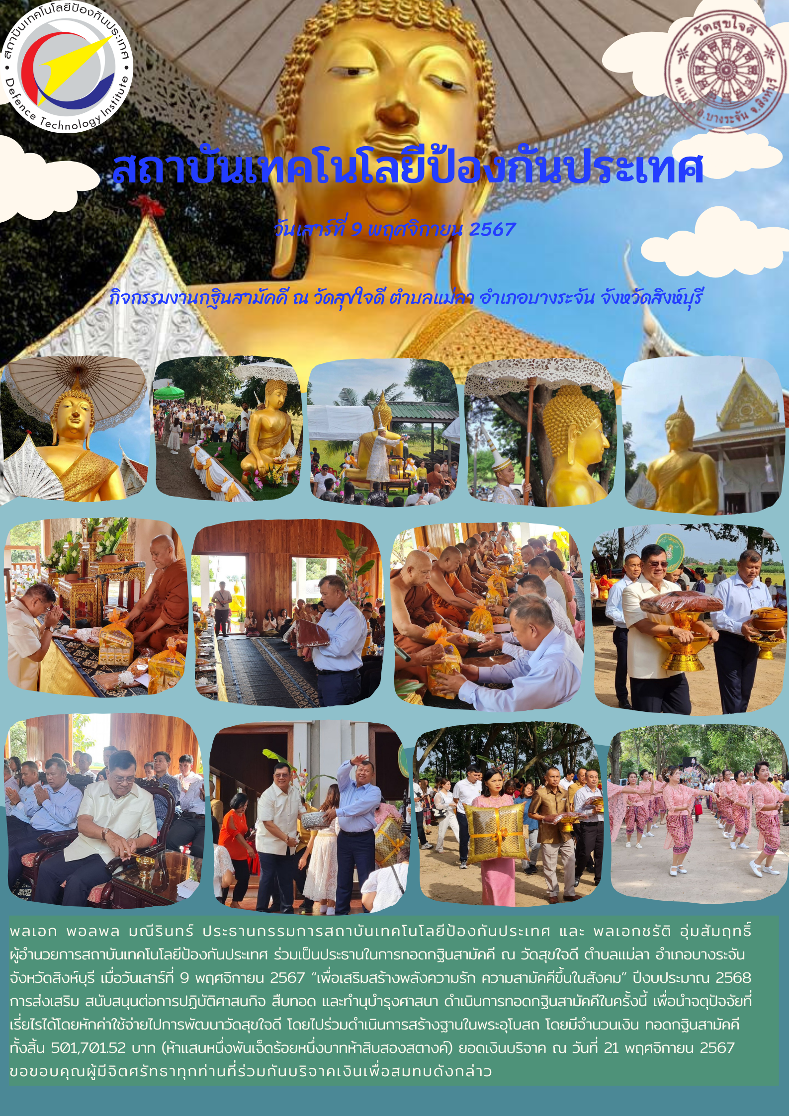 วันที่ 10 กุมภาพันธ์ 2568 ร่วมทำบุญตักบาตร ข้าวสาร อาหารแห้ง พระสงฆ์จากวัดชลประทานรังสฤษดิ์ พระอารามหลวง จ.นนทบุรี จำนวน 9 รูป เนื่องในโอกาส วันมาฆบูชา เพื่อส่งเสริมปลูกฝังจิตสำนึกด้านคุณธรรรม จริยธรรรม ตลอดจนความเป็นสิริมงคลต่อชีวิต และครอบครัวของผู้บริหาร เจ้าหน้าที่ ลูกจ้าง และผู้ปฏิบัติงานของสถาบันเทคโนโลยีป้องกันประเทศ