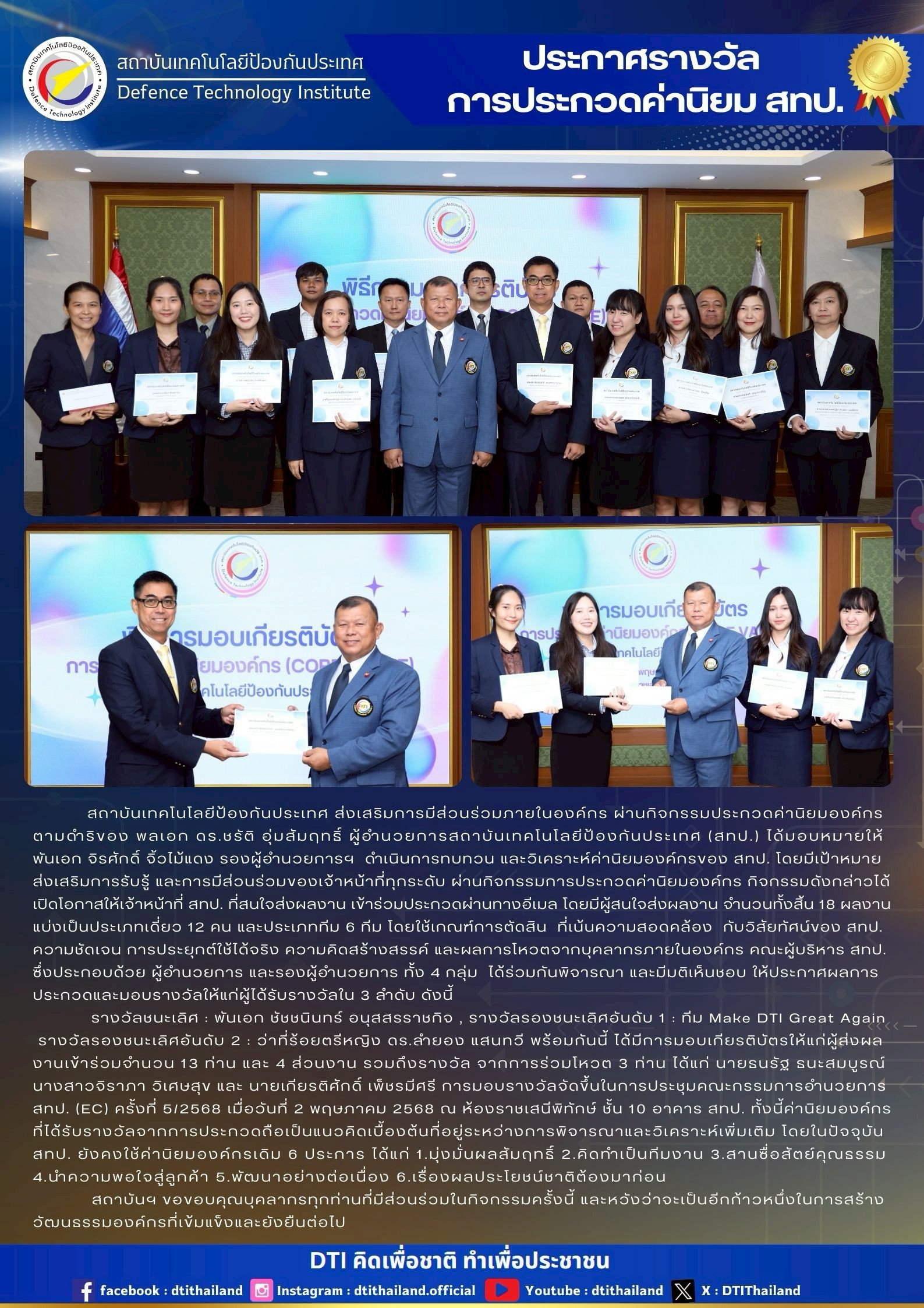 สถาบันเทคโนโลยีป้องกันประเทศ ส่งเสริมการมีส่วนร่วมภายในองค์กร ผ่านกิจกรรมประกวดค่านิยมองค์กร ตามดำริของ พลเอก ดร.ชรัติ อุ่มอุ้มสัมฤทธิ์ ผู้อำนวยการสถาบันเทคโนโลยีป้องกันประเทศ (สทป.) ได้มอบหมายให้ พันเอก จิรศักดิ์ จิ้วไม้แดง รองผู้อำนวยการฯ ดำเนินการทบทวน และวิเคราะห์ค่านิยมองค์กรของ สทป. โดยมีเป้าหมาย ส่งเสริมการรับรู้ และการมีส่วนร่วมของเจ้าหน้าที่ทุกระดับ ผ่านกิจกรรมการประกวดค่านิยมองค์กร ดังกล่าว ได้เปิดโอกาสให้เจ้าหน้าที่ สกป. ที่สนใจส่งผลงาน เข้าร่วมประกวดผ่านทางอีเมล โดยมีผู้สนใจส่งผลงาน จำนวนทั้งสิ้น 18 ผลงานแบ่งเป็นประเภทเดี่ยว 12 คน และประเภททีม 6 ทีม โดยใช้เกณฑ์การตัดสิน ที่เน้นความสอดดคล้อง กับวิสัยทัศน์ของ สทป. ความชัดเจน การประยุกต์ใช้ได้จริง ความคิดสร้างสรรค์ และผลการโหวตจากบุคลากรภายในองค์กร คณะผู้บริหาร สทป.