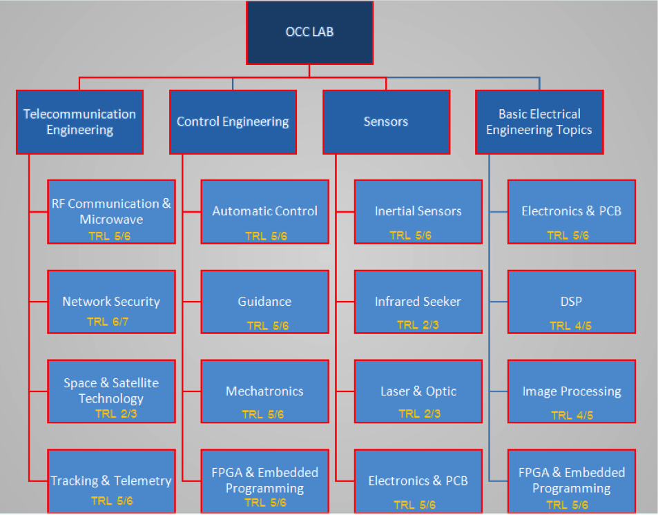ส่วนงานวิศวกรรมควบคุมและการสื่อสาร มีหน้าที่รับผิดชอบการวิจัยและการออกแบบองค์ประกอบพื้นฐานในงานวิศวกรรมควบคุมสำหรับยุทโธปกรณ์ต่างๆ ซึ่งประกอบด้วย ระบบสมองกลฝังตัวและอิเล็กทรอนิกส์ ระบบควบคุมอัตโนมัติ และการนำวิถีแบบต่างๆ รวมถึงระบบสื่อสารทางยุทธวิธี เช่น ระบบสื่อสารความถี่สูง ระบบเรดาร์และการติดตาม ระบบสายอากาศ ระบบสื่อสารเชิงแสง การประมวลภาพและสัญญาณ ตลอดจนการพัฒนาเพื่อให้เกิดความเชี่ยวชาญเฉพาะด้านและเผยแพร่องค์ความรู้ผ่านบทความทางวิชาการ พร้อมทั้งให้การสนับสนุนและประสานงานกับ ส่วนงาน/โครงการอื่นๆ ตามขอบเขตที่รับผิดชอบหรือตามที่ได้รับมอบหมาย สามารถแบ่งความเชี่ยวชาญ/ความชำนาญ และองค์ความรู้ ได้เป็น 4 ด้านหลักๆ ดังนี้ 1. Telecommunication Engineering 2. Control Engineering 3. Sensors Electronics & Optics 4. Basic Electrical Engineering เนื่องจากยังไม่มีการจัด Organizational Capability Index ที่ชัดเจน ทาง OCC จะขอใช้ TRL ในการวัด ในเบื้องต้น |