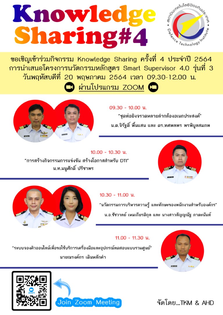 |      ส่วนงานบริหารองค์ความรู้ (TKM) ร่วมกับส่วนพัฒนาทรัพยากรบุคคล (AHD) จัดกิจกรรม Knowledge Sharing ครั้งที่ 4 ประจำปี 2564 "การนำเสนอโครงการนวัตกรรมหลักสูตร Smart Supervisor 4.0 รุ่นที่ 3"       โดยเชิญผู้เข้ารับการอบรมโครงการดังกล่าวมาเป็นวิทยากรเพื่อถ่ายทอดองค์ความรู้ตามหลักสูตรที่เข้ารับอบรมต่อไป  |