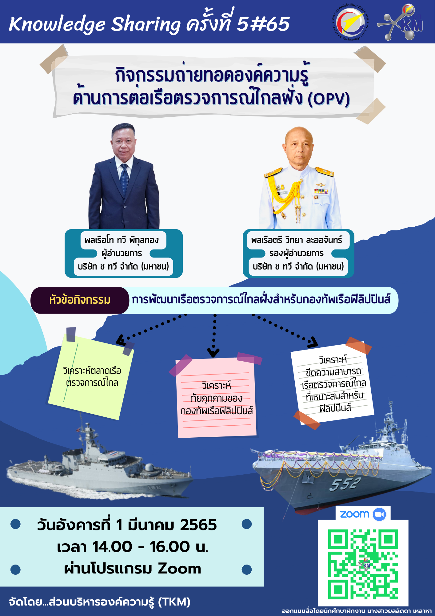 ส่วนบริหารองค์ความรู้ (Knowledge Management Division - TKM) ร่วมกับ ส่วนความร่วมมือระหว่างประเทศ (International collaboration Division - SIC) จัดกิจกรรม Knowledge Sharing ครั้งที่ 5 ประจำปี 2565 เรื่อง "การถ่ายทอดองค์ความรู้ด้านการต่อเรือตรวจการณ์ไกลฝั่ง (OPV)" วันอังคารที่ 1 มีนาคม 2565 เวลา 14.00-16.00 น. ผ่านโปรแกรม ZOOM |