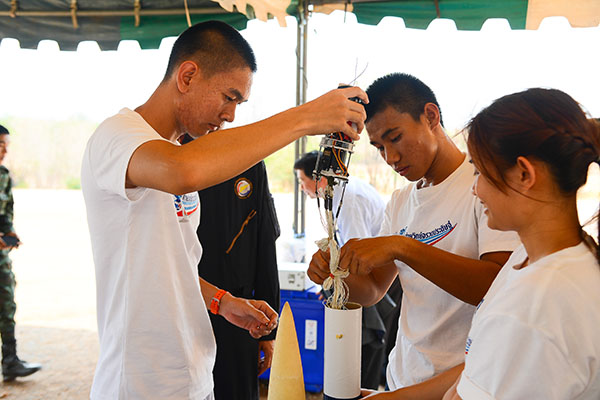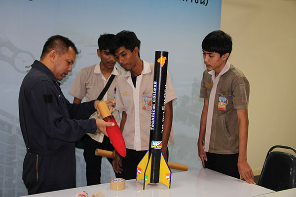 การคัดเลือกนักศึกษาเข้าร่วมกิจกรรม ค่ายจรวดประดิษฐ์เพื่อการสื่อสารปี 59 สทป. ได้ร่วมมือกับสำนักงานคณะกรรมการการอาชีวศึกษา ให้เป็นผู้คัดเลือกนักศึกษาและอาจารย์จากวิทยาลัยเทคนิคในเขตกรุงเทพและจังหวัดใกล้เคียง จำนวน 16 สถาบัน ร่วมกับโรงเรียนนักเรียนทหารที่เทียบเคียงอีก 2 สถาบัน นักศึกษาสถาบันละ 5 คน รวมเป็น 18 ทีม รวมจำนวนนักศึกษา 90 คน และอาจารย์ที่ปรึกษาจากวิทยาลัยรวม 30 คน จากวิทยาลัยเทคนิคมีนบุรี, ราชสิทธาราม, ดอนเมือง, ฉะเชิงเทรา, สมุทรสงคราม, ชลบุรี, ระยอง, สมุทรสาคร, สิงห์บุรี, ลพบุรี, สมุทรปราการ, พระนครศรีอยุธยา, สระบุรี, ราชบุรี, นครปฐม, สุพรรณบุรี, โรงเรียนอิเล็กทรอนิกส์ ทหารเรือ และโรงเรียนจ่าอากาศ |