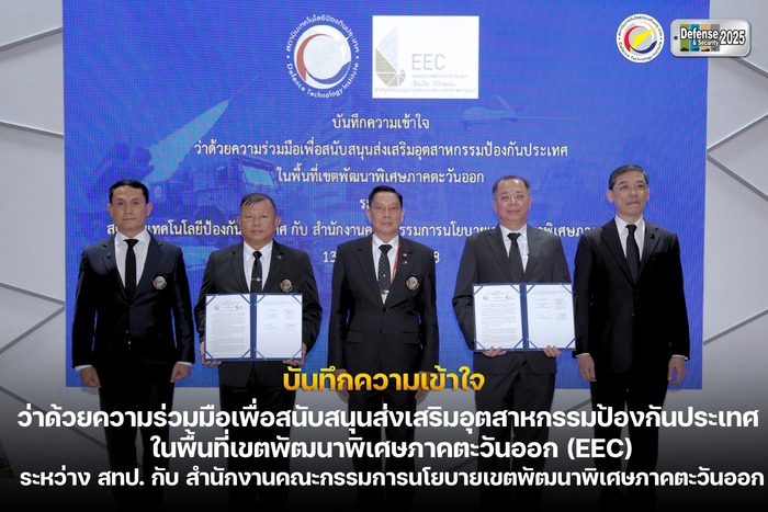 สทป. จับมือ สกพอ. ขับเคลื่อนอุตสาหกรรมป้องกันประเทศในพื้นที่ EEC เสริมสร้างเศรษฐกิจความมั่นคงของชาติให้เติบโตอย่างยั่งยืน (วันที่ 13 พฤศจิกายน 2568)