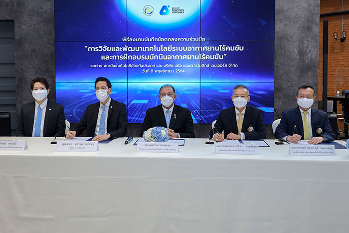 วันที่ 8 พฤศจิกายน 2564 สทป. และ “บริษัท เอไอ แอนด์ โรโบติกส์ เวนเจอร์ส จำกัด” หรือ (ARV) ในกลุ่ม ปตท.สผ. จัดพิธีลงนามบันทึกความเข้าใจการวิจัยและพัฒนาเทคโนโลยีระบบอากาศยานไร้คนขับและการฝึกอบรมนักบินอากาศยานไร้คนขับ โดย พล.อ.อ.ดร.ปรีชา ประดับมุข ผอ.สทป. และ ดร.ธนา สราญเวทย์พันธุ์ ผู้จัดการทั่วไป AVR ร่วมลงนามในบันทึกความเข้าใจฯ โดยได้รับเกียรติจาก นายมนตรี ลาวัลย์ชัยกุล ประธานเจ้าหน้าที่บริหาร บริษัท ปตท.สผ. เป็นสักขีพยาน และคณะผู้บริหาร เจ้าหน้าที่จากทั้ง 2 หน่วยงานร่วมเป็นสักขีพยาน ณ อาคารภิรัชทาวเวอร์ แอท สาทร กรุงเทพมหานคร |