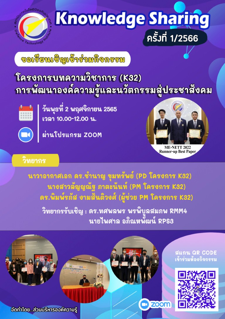 | ส่วนงานบริหารองค์ความรู้ (TKM) จัดกิจกรรม Knowledge Sharing ครั้งที่ 1 ประจำปีงบประมาณ 2566 ครั้งที่ 1 ประจำปี 2566 เรื่อง “โครงการบทความวิชาการ (K32) การพัฒนาองค์ความรู้และนวัตกรรมสู่ประชาสังคม” โดย เจ้าหน้าที่บริหารองค์ความรู้ รูปแบบออนไลน์ วันพุธที่ 2 พฤศจิกายน 2565 เวลา 10.00-12.00 น. ผ่านโปรแกรม ZOOM |