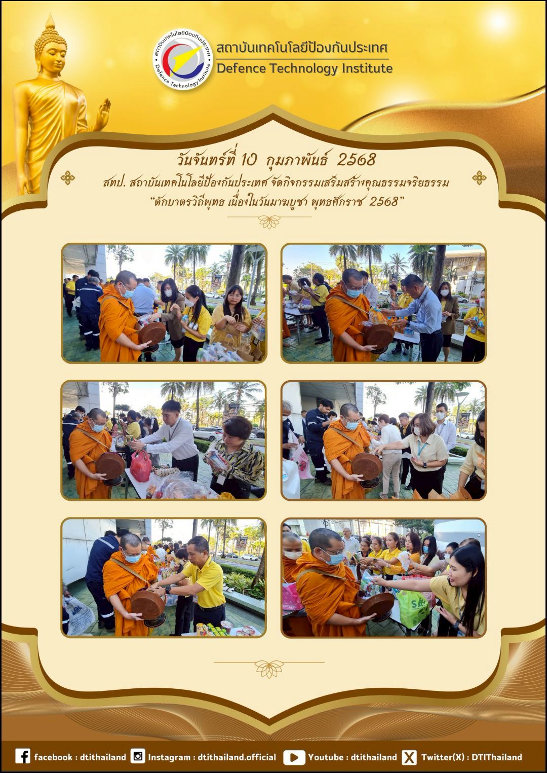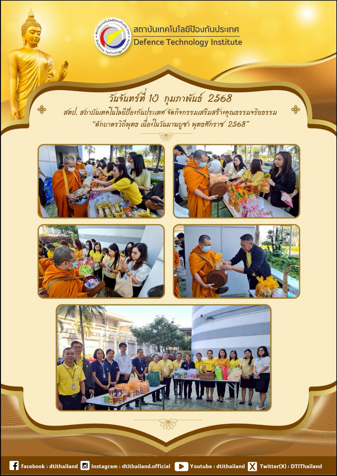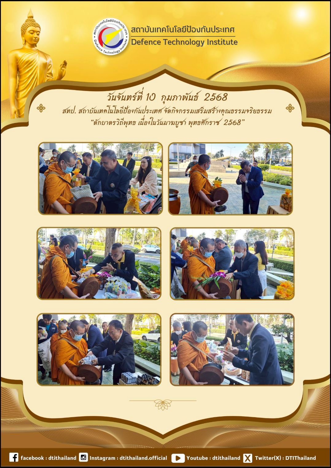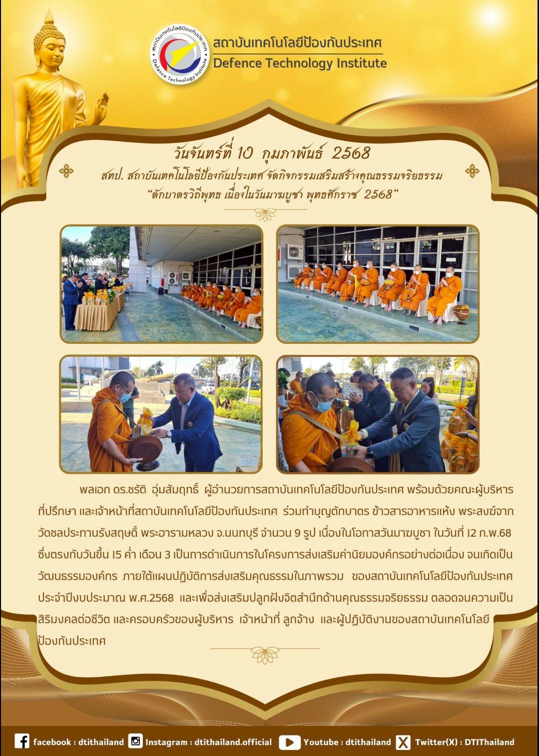 วันที่ 10 กุมภาพันธ์ 2568 ร่วมทำบุญตักบาตร ข้าวสาร อาหารแห้ง พระสงฆ์จากวัดชลประทานรังสฤษดิ์ พระอารามหลวง จ.นนทบุรี จำนวน 9 รูป เนื่องในโอกาส วันมาฆบูชา เพื่อส่งเสริมปลูกฝังจิตสำนึกด้านคุณธรรรม จริยธรรรม ตลอดจนความเป็นสิริมงคลต่อชีวิต และครอบครัวของผู้บริหาร เจ้าหน้าที่ ลูกจ้าง และผู้ปฏิบัติงานของสถาบันเทคโนโลยีป้องกันประเทศ