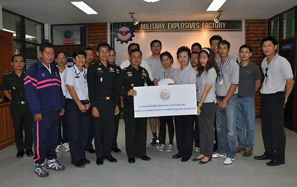 | สถาบันเทคโนโลยีป้องกันประเทศ (องค์การมหาชน) มอบเงินบริจาคจากน้ำใจเจ้าหน้าที่ให้แก่ พลตรี พลวัส แก้วเรียน ผู้อำนวยการโรงงานวัตถุระเบิดทหาร เพื่อนำไปจัดหาอาหารและน้ำดื่มไปช่วยเหลือผู้ประสบอุทกภัยในพื้นที่ที่ถูกตัดขาดการสัญจร ในเขต อ.พยุหะคีรี จว.นครสวรรค์ ตามโครงการสำนักงานปลัดกระทรวงกลาโหมช่วยเหลือผู้ประสบอุทกภัย เมื่อวันที่ 19 ตุลาคม 2554 |