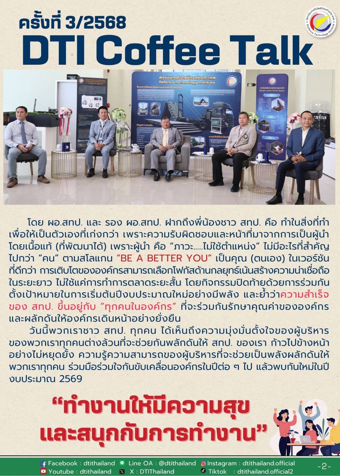 กิจกรรมแลกเปลี่ยนเรียบรู้การสร้างการตระหนักรู้ สร้างกระบวนการสื่อสารจาก ผอ.สทป.และผู้บริหารสู่เจ้าหน้าที่ ภายใต้กิจกรรม "DTI COFFEE TALK" ครั้งที่ 3/2568 ฝ่ายบริหารกลาง ร่วมกับ ฝ่ายทรัพยากรบุคคล จัดกิจกรรมแลกเปลี่ยนเรียนรู้ การสร้างการตระหนักรู้ สร้างกระบวนการสื่อสารจาก ผอ.สทป. และผู้บริหาร สู่เจ้าหน้าที่ ภายใต้กิจกรรม "DTI COFFEE TALK" ครั้งที่ 3/2568 โดยมี พลเอก ดรชรัติ อุ่มสัมสัมสัมฤทธิ์ ผอ.สทป, รองผอ. สทป. ทุกกลุ่มงาน, พร้อมด้วยคณะที่ปรึกษา ผู้เชี่ยวชาญ เจ้าหน้าที่ ลูกจ้าง และผู้ช่วยปฏิบัติงาน ร่วมพูดคุยแลกเปลี่ยนข้อคิดเห็นซึ่งกันและกัน
