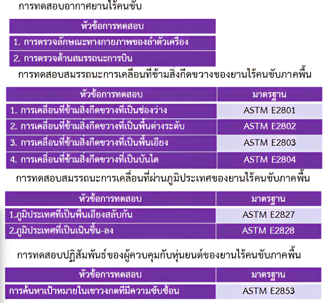 ห้องปฏิบัติการทดสอบยานไร้คนขับ อากาศยานไร้คนขับ -การตรวจสอบลักษณะทั่วไป เช่น การตรวจสอบขนาด การตรวจสอบน้ำหนัก -การตรวจสอบคุณลักษณะทางกายภาพของลำตัวเครื่อง -การตรวจด้านสมรรถนะด้านการบินของอากาศยานไร้คนขับ (UAV) ที่มีขนาดไม่เกิน 150 kg ให้เป็นไปตามมาตรฐานยุทโธปกรณ์กระทรวงกลาโหมว่าด้วยระบบอากาศยานไร้คนขับแบบปีกนิ่ง น้ำหนักบินขึ้นสูงสุดน้อยกว่า ๑๕๐ กิโลกรัม. (กมย.กห ๒/๒๕๖๒) ยานภาคพื้นไร้คนขับ - การตรวจสอบสมรรถนะด้านการเคลื่อนที่ของยานภาคพื้นไร้คนขับ (UGV) หน่วยตรวจมีสนามทดสอบการเคลื่อนที่ข้ามสิ่งกีดขวาง ที่ได้มาตรฐาน ASTM E2801-11 สนามทดสอบการเคลื่อนที่ผ่านภูมิประเทศที่มีลักษณะเป็นเนินขึ้น-ลง (Symmetic Stepfields) ตามมาตรฐาน ASTM E2828-11 และสนามทดสอบการเคลื่อนที่ผ่านภูมิประเทศที่เป็นพื้นเอียงสลับกัน ตามมาตรฐาน ASTM E2827-11 สามารถรับทดสอบยานภาคพื้นไร้คนขับที่มีน้ำหนักไม่เกิน 100 kg |