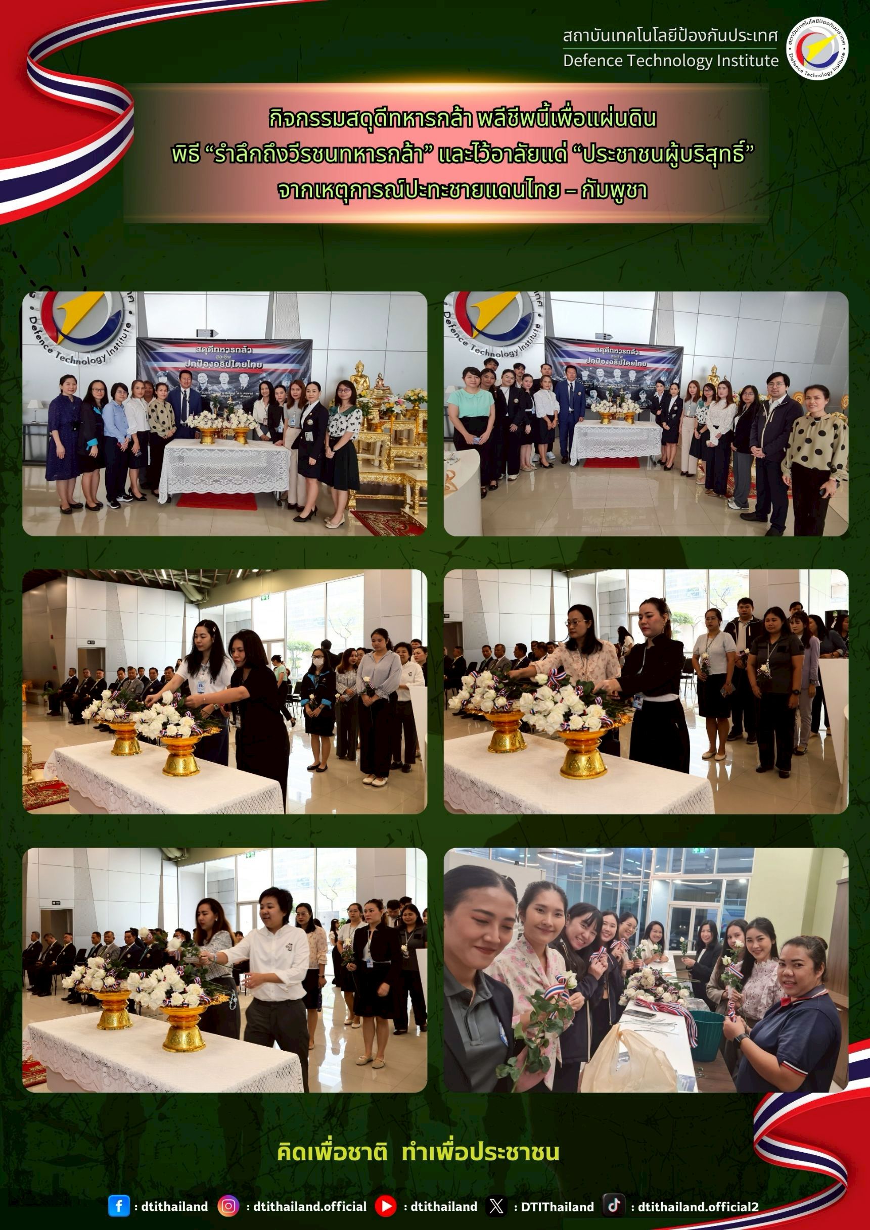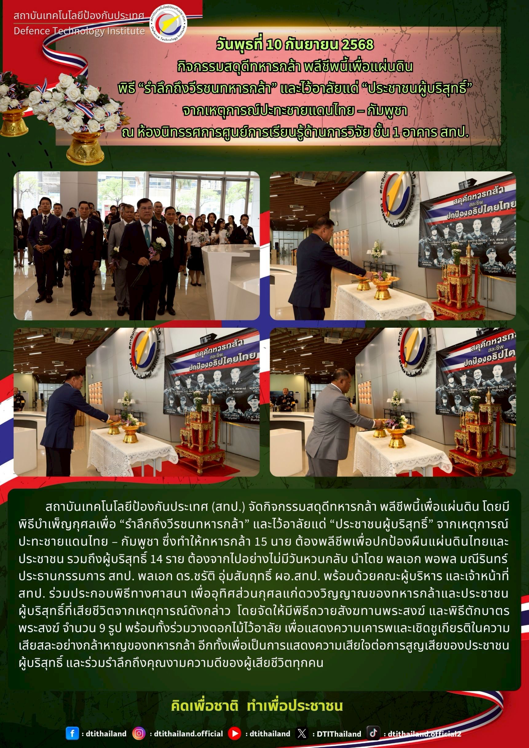 วันที่ 10 กันยายน 2568 กิจกรรมสดุดีทหารกล้า พลีชีพนี้เพื่อแผ่นดินดิน พิธี "รำลึกถึงวีรชนทหารกล้า" และไว้อาลัยแด่ "ประชาชนผู้บริสุทธิ์" จากเหตุการณ์ปะทะชายแดนไทย - กัมพูชา ณ ห้องนิทรรศการศูนย์การเรียนรู้ด้านการวิจัย ชั้น 1 อาคาร สทป.